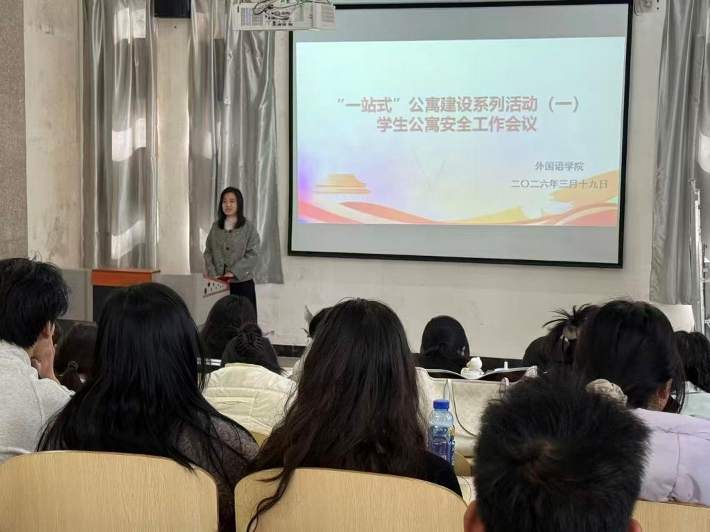 为深入落实学校关于加强学生公寓安全建设的工作部署,稳步推进 “一站式” 学生公寓建设走深走实,3 月 19 日下午,外国语学院在新逸夫楼 124 教室召开学生公寓安全培训会议。本次培训为学院 “一站式” 公寓建设系列活动的首场活动,由学工办主任张英老师主持,学院各年级班长、宿舍长参加。