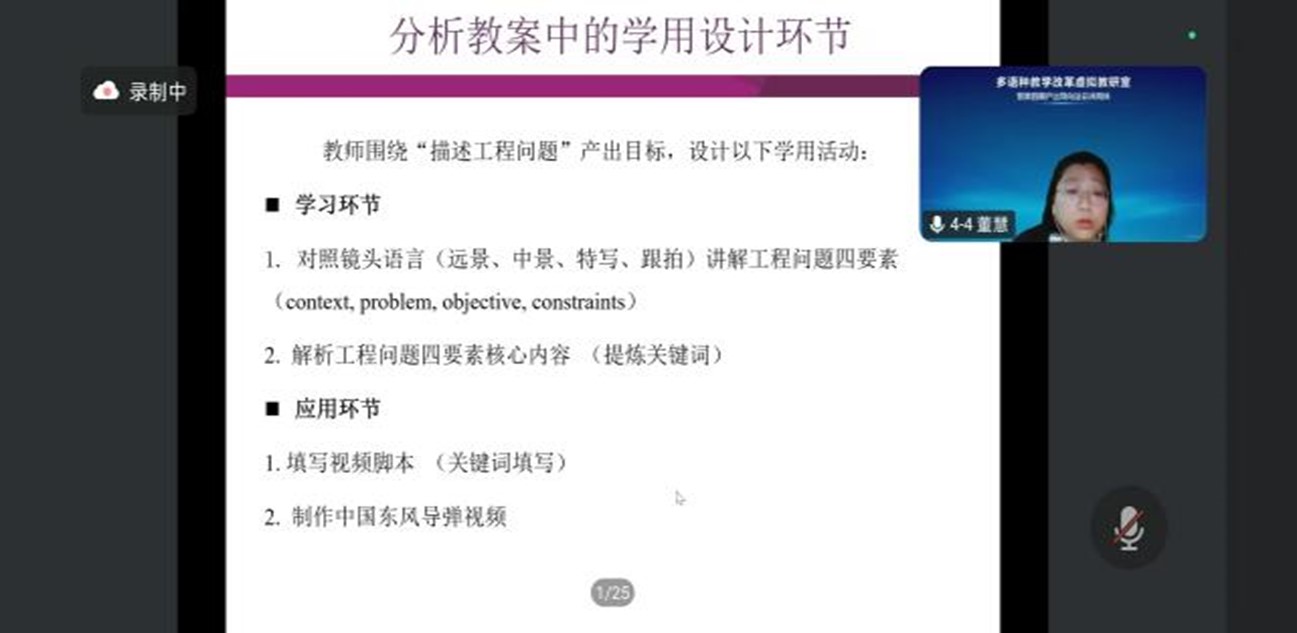 在此次活动中,我院教师、北京外国语大学英美文学博士董慧老师,代表第四组新学员进行教学示范展示。在首都师范大学邱琳老师的指导下,董慧老师紧扣POA理论中的“学用一体”教学理念,精心设计教学活动,逻辑清晰、实践性强,充分展现了扎实的理论功底与出色的教学能力。
