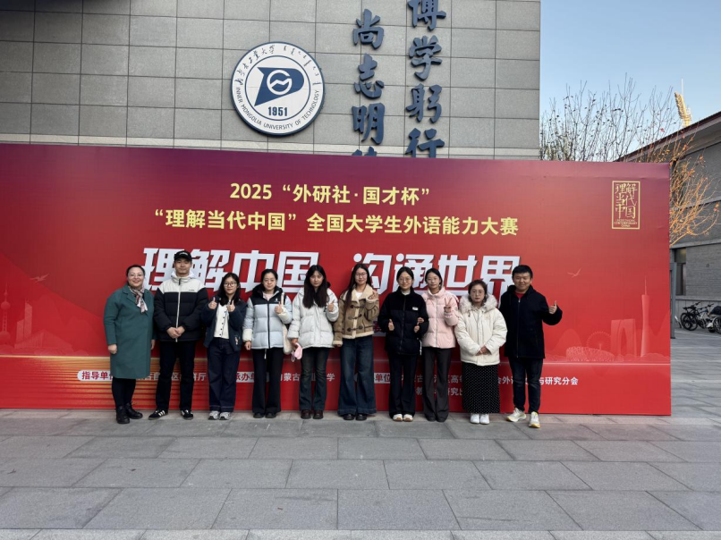 2025 年 10 月 31 日至 11 月 2 日,2025“外研社・国才杯”“理解当代中国” 全国大学生外语能力大赛内蒙古自治区赛在呼和浩特市内蒙古工业大学新城校区隆重举办。外国语学院选派王坤、雷春阳两位教师带队,组织学院学生参赛。同学们最终凭借扎实的语言功底、出色的综合素养及稳定的现场发挥,在多个赛项中斩获佳绩,充分展现了我校外国语学院的教学改革成果及学生良好的国际传播素养和综合能力。