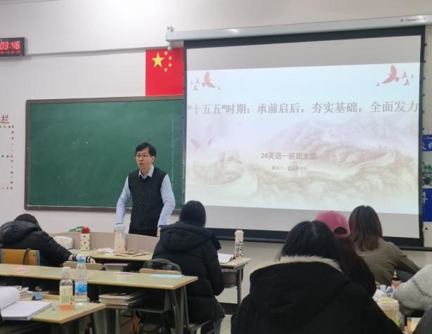 11月19日下午,2024级英语1班团支部于南逸夫楼202教室组织“党团合力解时事”--党的二十届四中全会精神系列主题团日活动。活动特邀党总支书记盖永涛担任主讲,围绕“十五五”时期经济社会发展的重大意义、重要地位与青年使命展开深入解读。
