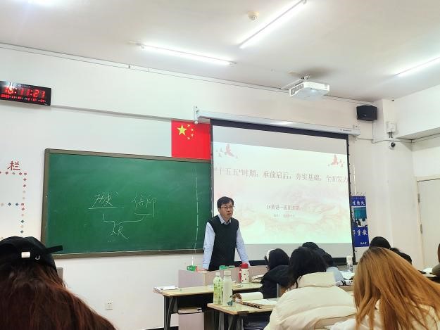 盖永涛从历史逻辑、现实需求和未来导向三个维度,系统阐释了“十五五”时期在社会主义现代化进程中的重要意义和重要地位。他结合英语专业学生的成长实际,强调青年一代在国家现代化建设中的责任与担当,既有理论高度,又贴近学生发展需求。在互动环节,同学们踊跃发言,围绕“专业所长服务国家发展”“青年使命担当”等话题展开热烈讨论。大家一致表示,要将个人理想融入国家发展大局,以专业能力贡献青春力量。